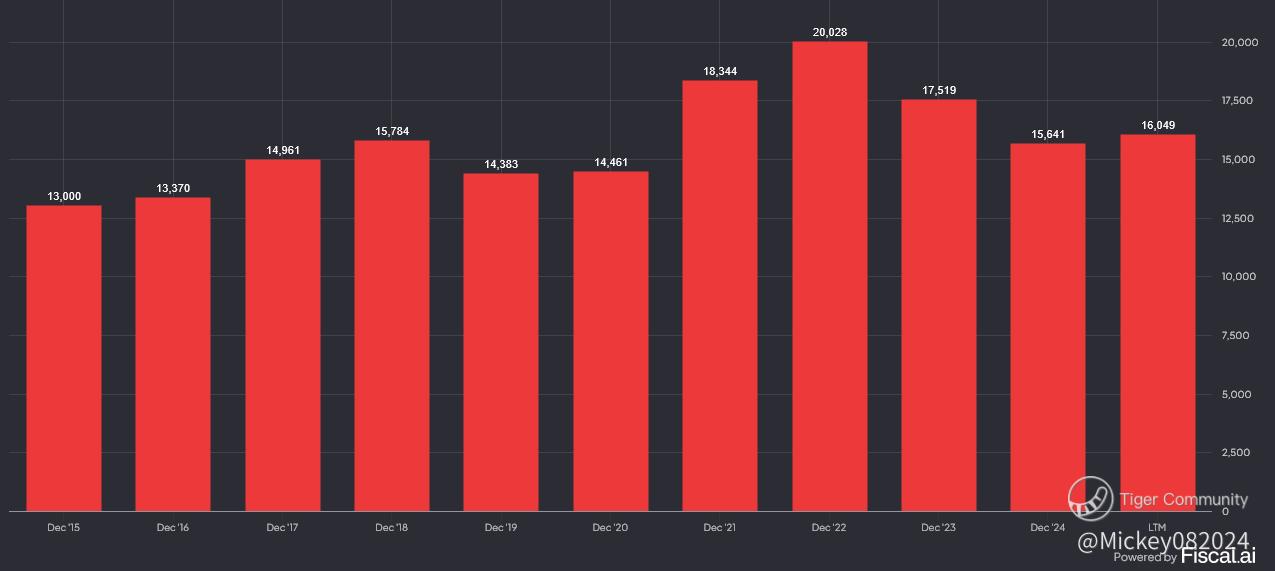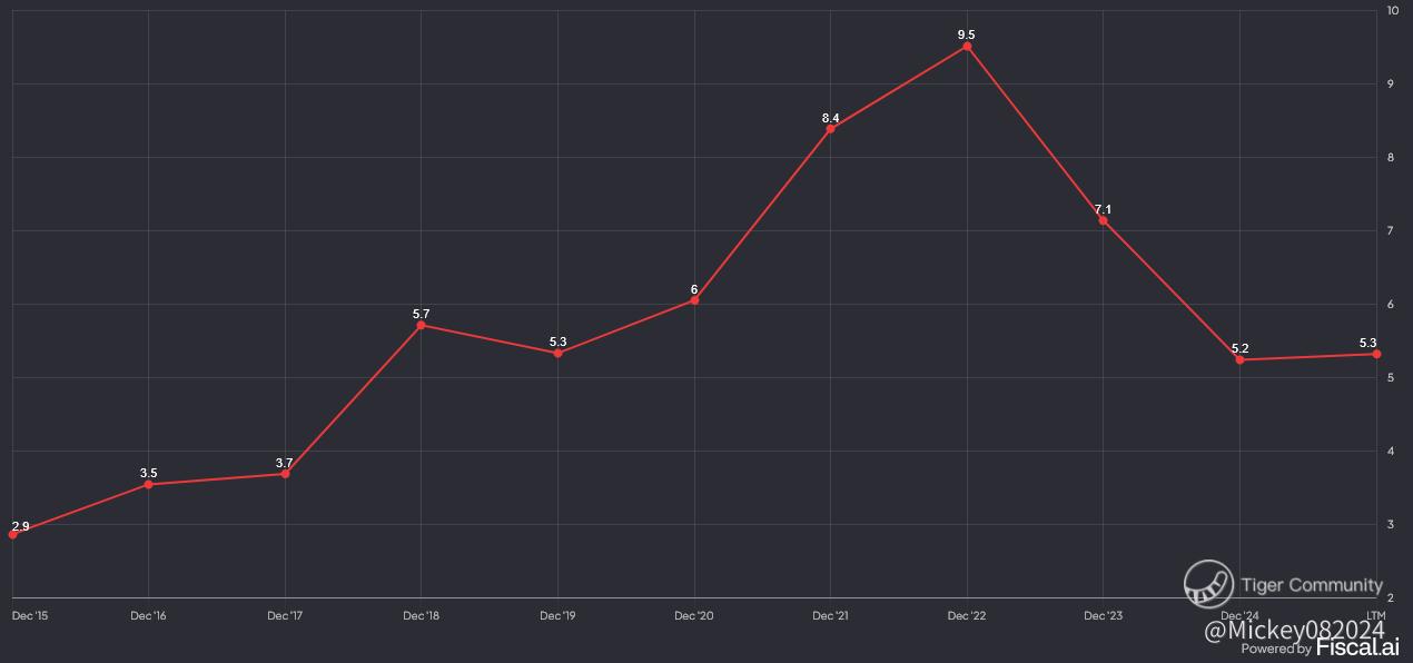 Over the past 10 years, EPS growth has averaged ~8% annually — solid, but not extraordinary. In fact, over the past 4 years, growth has decelerated, and recent earnings declines (especially in 2023) underscore the cyclical nature of the industry.