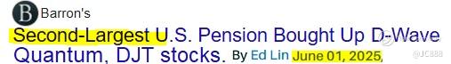 On 01 Jun 2025, it was reported that US 2nd largest pension fund - The California State Teachers’ Retirement System (Calstrs), in its 13F filing, has increased its QBTS holdings and a few other stocks in Q1 2025.