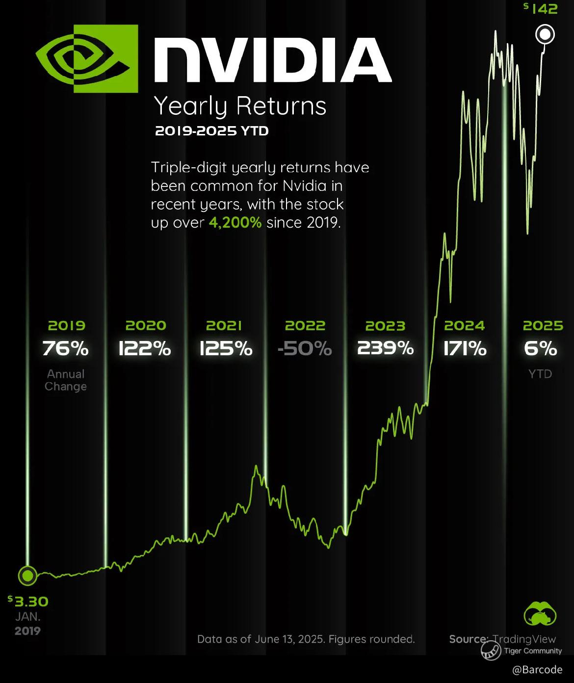 From a humble $3.30 in Jan 2019 to a scorching $142 in Jun 2025, Nvidia has delivered a jaw-dropping 4,200% return, registering triple-digit gains in every year except 2022. Even with a modest 6% YTD rise, the set-up remains electric.
