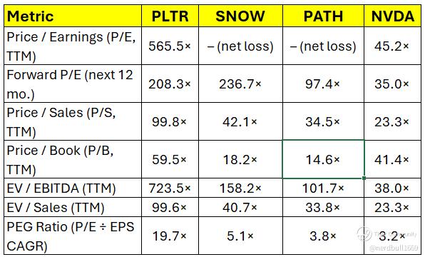 $Snowflake(SNOW)$ and $UiPath(PATH)$ trade at rich P/S but much lower P/B and EV multiples versus PLTR, suggesting investors price in continued hypergrowth but with somewhat more mature margin profiles.