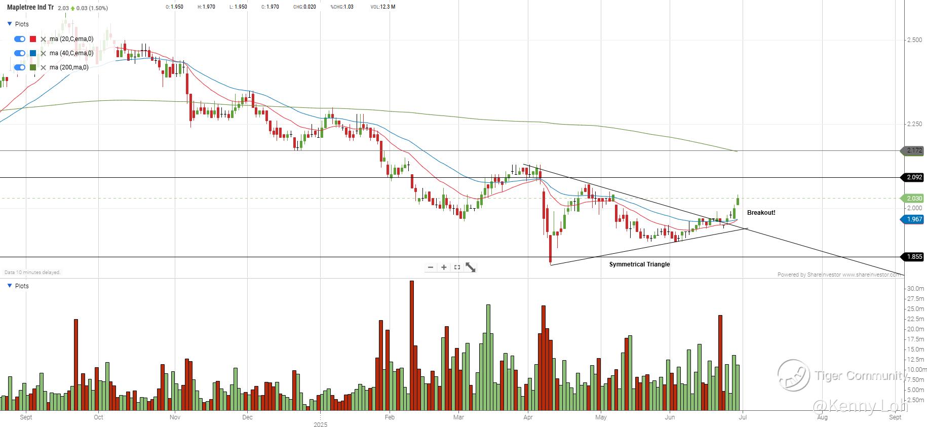 $Mapletree Ind Tr(ME8U.SI)$ broke out (up) from a Symmetrical Triangle, a trend reversal pattern at the bottom of the chart. [Call]