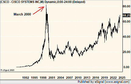 And as another observation on this one, it also goes to show how the hype cycle can leave very high hurdles for long-term investors… despite a long bull market in Cisco stocks, it’s still yet to recapture the all-time high.