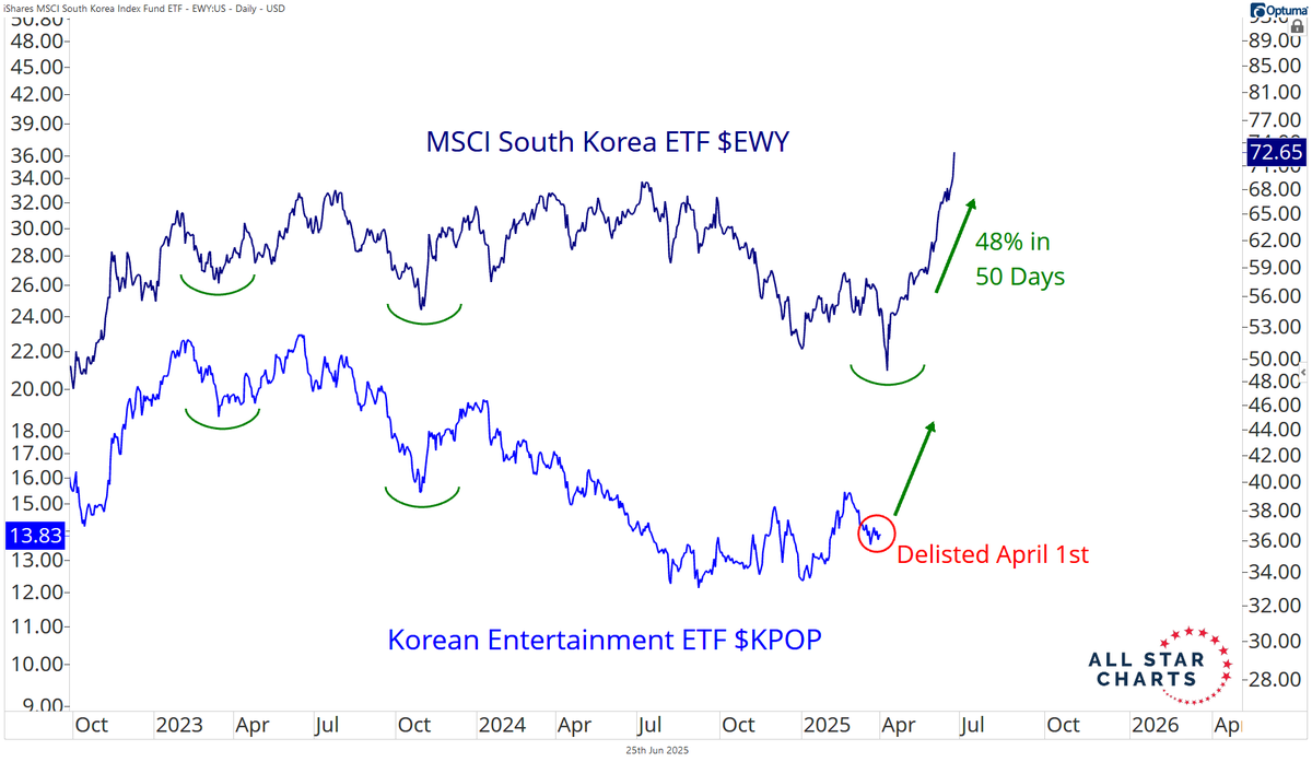 9. Blessed by Delisting (1/2): This is something I’ve noticed too, and it’s not just about ETF delistings, you also see things like index reshuffles and fund launches marking the top/bottom or turning points. But as the chart author notes, this particular ETF delisting marked a key inflection point in markets: “Best April fools of the year goes to KPOP being delisted just as South Korean stocks EWY soared nearly 1% EVERY DAY for 50 DAYS.”