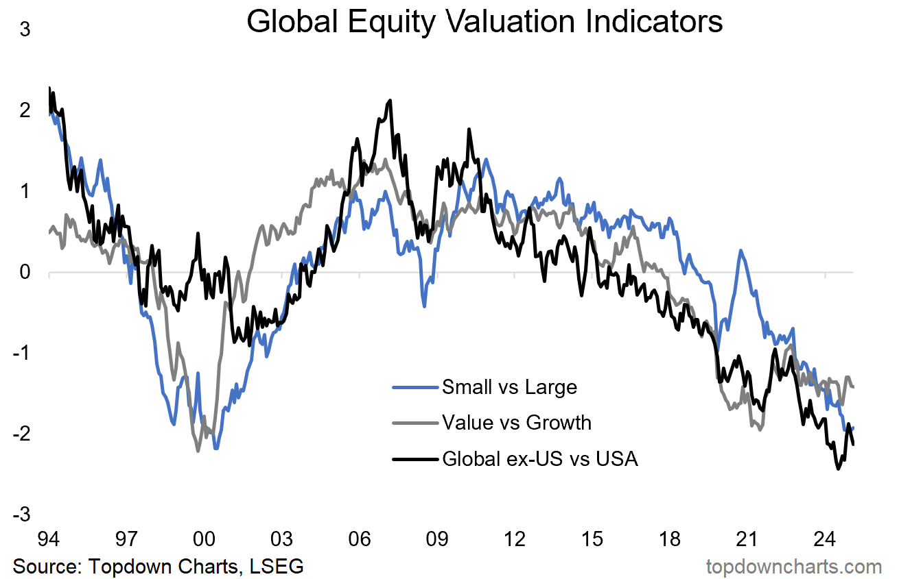 There’s two ways to look at this: 1. US/Large/Growth is expensive vs everything else, and is at risk of catching-down; and/or 2. Global/Small/Value are cheap, and the upside opportunity is they catch-up.