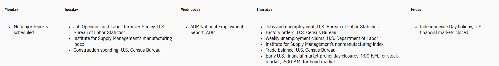 On Monday, S&P Global reported that U.S. business activity expanded in June, albeit at a moderately slower rate than in May. The Flash U.S. Composite Output Purchasing Managersβ Index (PMI) registered a reading of 52.8, down slightly from Mayβs reading of 53.0 (readings above 50 indicate expansion, while readings below 50 signal contraction). The composite reading was buoyed by the first rise in manufacturing output since February, which helped offset a modest deceleration in the services sector. Inflation continued to be a drag, with the overall rise in costs hitting the second highest level since the start of 2023, which was widely blamed on tariffs.