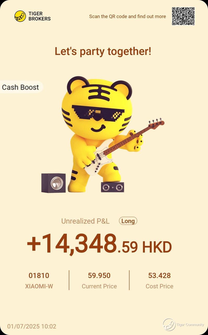 $XIAOMI-W(01810)$ What a joyful moment! Xiaomi-W has delivered a 14,348.59 HKD unrealized gain! Rising from my entry at 53,428 to the current 59,950, witnessing the growth of this tech brand I truly believe in brings both financial and emotional rewards. Staying invested in familiar sectors I understand deeply always proves to be the wisest choice. The market rewards patience and conviction!