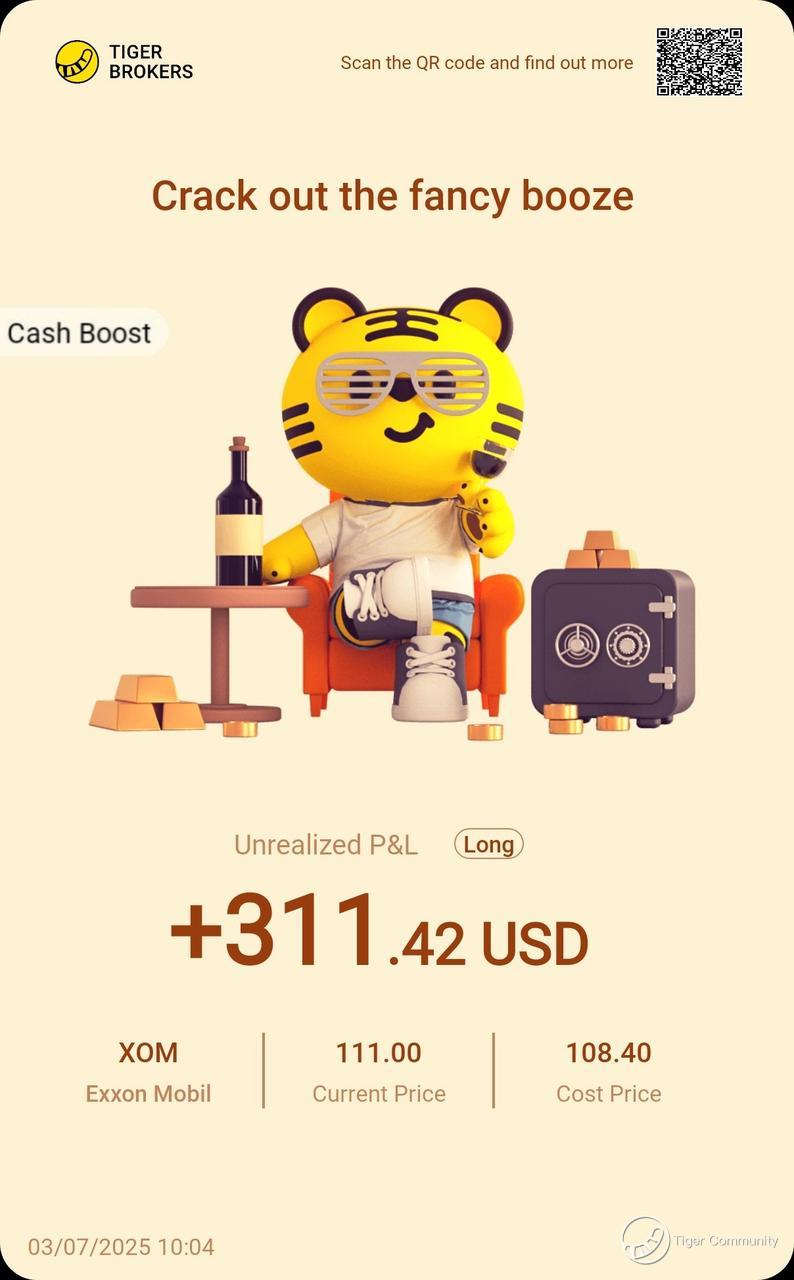 $Exxon Mobil(XOM)$ posted a steady $311 gain in one day, demonstrating the resilience of this energy giant. The position rose from $108.40 to $111.00, delivering a 2.4% daily increase and $311.42 in profits. This trade confirms the sustained profitability of traditional energy leaders amid high oil prices.