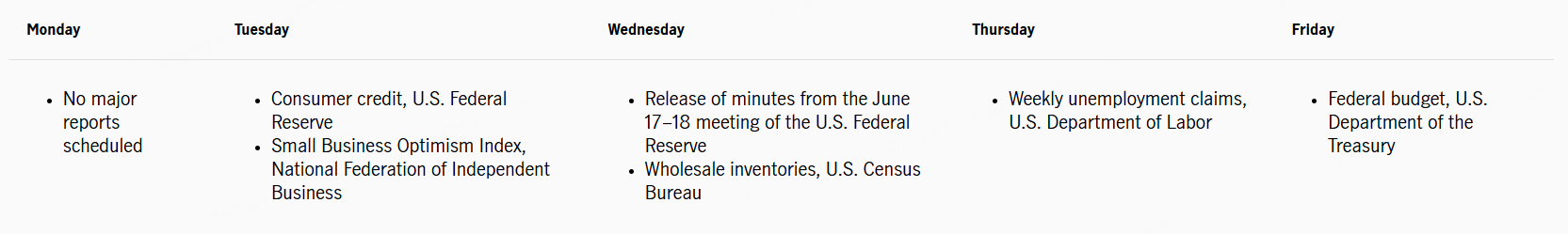 Major U.S. stock indexes finished the holiday-shortened week higher. Smaller-cap indexes performed best, with the S&P MidCap 400 and Russell 2000 indexes climbing 2.85% and 3.52%, respectively, followed by the Dow Jones Industrial Average, which advanced 2.30%. The S&P 500 Index and Nasdaq Composite both closed at all-time highs for the second week in a row. U.S. markets closed early Thursday and were closed Friday in observance of the Independence Day holiday, and T. Rowe Price traders noted that the week included several fairly quiet trading sessions heading into the long weekend.