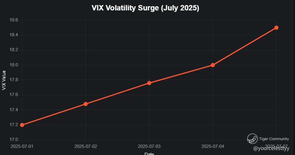 The VIX, measuring expected S&P 500 volatility, has risen amid tariff uncertainty. On July 3, 2025, it closed at 17.76, up 1.6% from 17.48 on July 2. By July 7, it hit 18.50, reflecting growing unease. Claims of an 8% pop may be exaggerated, as the week’s increase was closer to 5-6%. Key metrics: