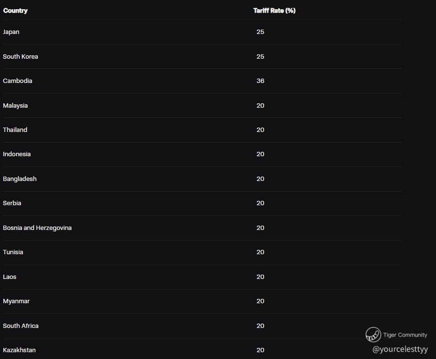 Tariff Rates: Japan and South Korea face 25% tariffs, Cambodia 36% (down from 49% in April), and others range from 10% to 70%, depending on trade deficits.
