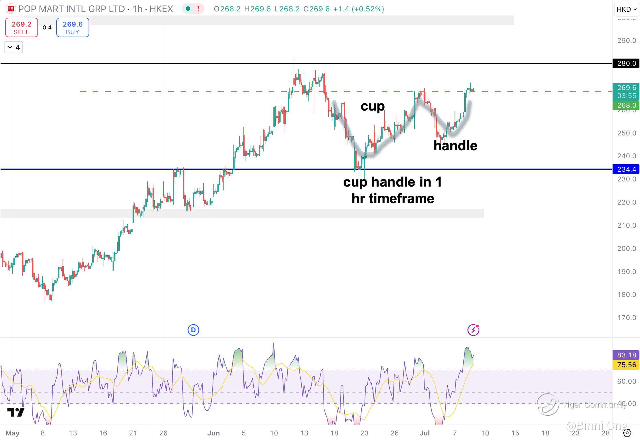 $POP MART(09992)$ (HKEX) Cup and Handle Formation on 1-Hour Chart