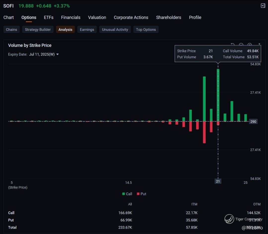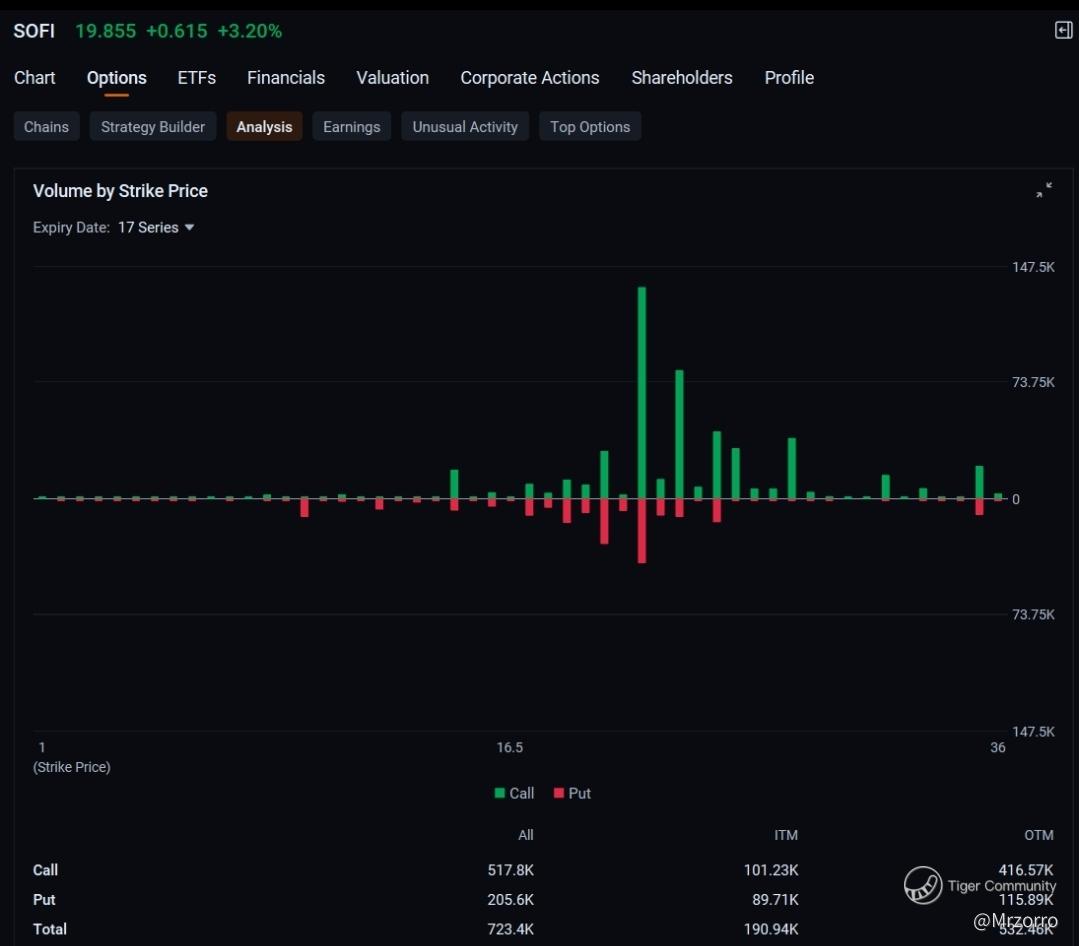 Total volume, including put options, reached 723,400 contracts so far, compared with the average 451,070. That puts SoFi on course to be the third most active stock option, ahead of $Amazon (AMZN.US)$, $Apple (AAPL.US)$ and $Robinhood (HOOD.US)$ .