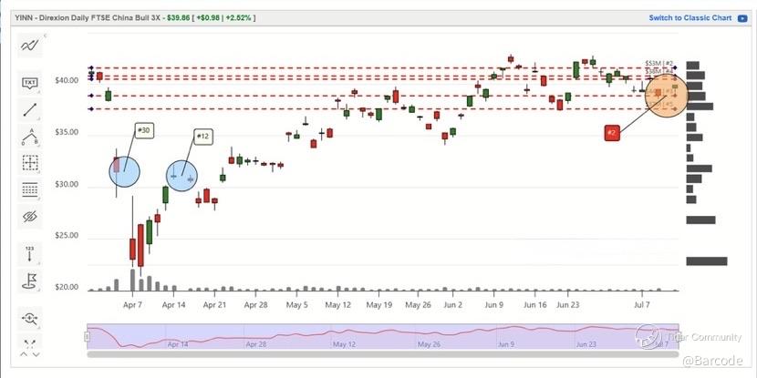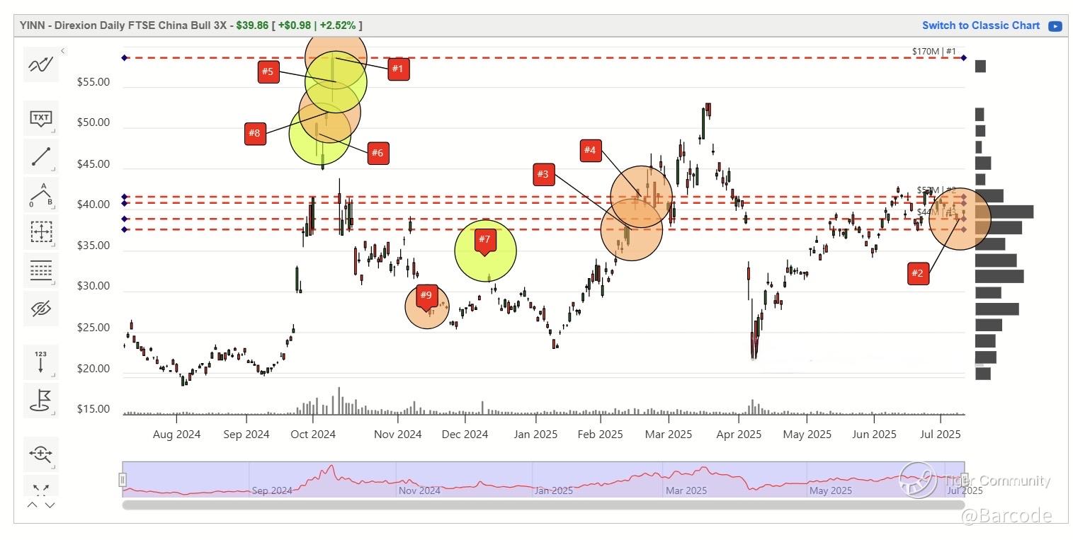 Let’s break this down. $YINN is a 3x levered play on $FXI, and this kind of size doesn’t show up by accident. That October 2023 print (#1) marked the exact peak of a euphoric squeeze. This time, the second-largest print arrived at the midrange, with $170M in volume sitting above and a fresh $53M block at current price.