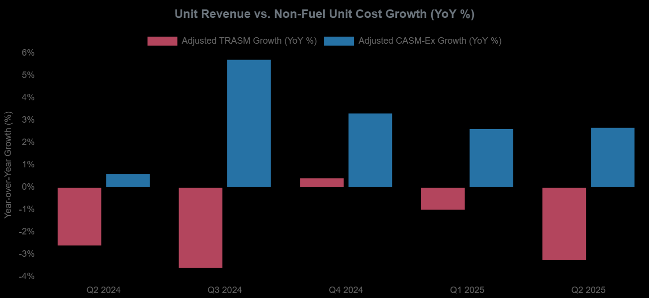 Revenue growth was limited by a 3% decline in total adjusted revenue units (TRASM), linked to weak consumer demand and fare pressure.However,, despite capacity growth of 4% and strong performance in premium markets and ancillary businesses: