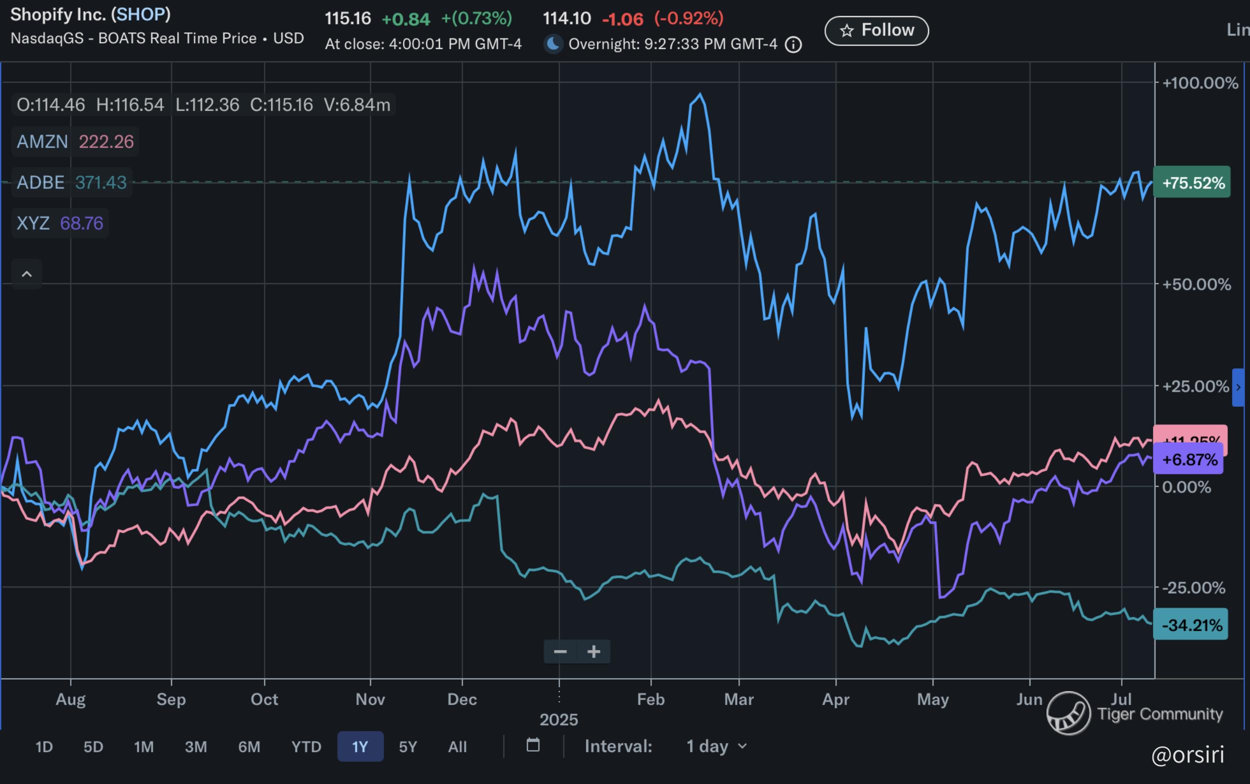 Shopify pulls ahead, outpacing Amazon, Adobe, and Block convincingly.