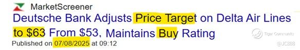 $Deutsche Bank AG(DB)$ raised DAL price target to $63, from $53 while maintaining a “Buy” rating as well.