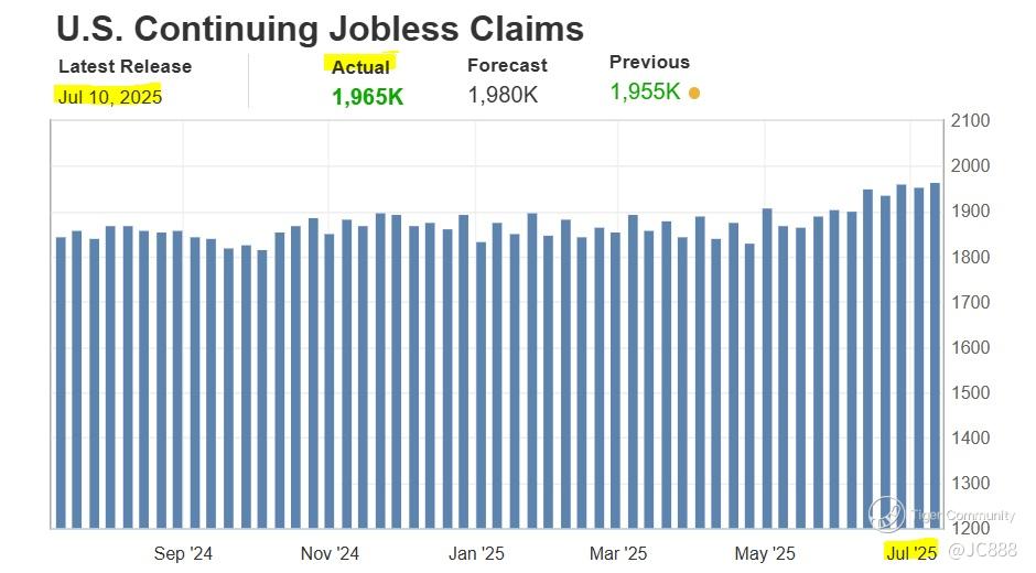 For week ending 28 Jun 2025, continuing claims rose to 1.965 million, up by +10,000 claims from 1.955 million in the prior week.