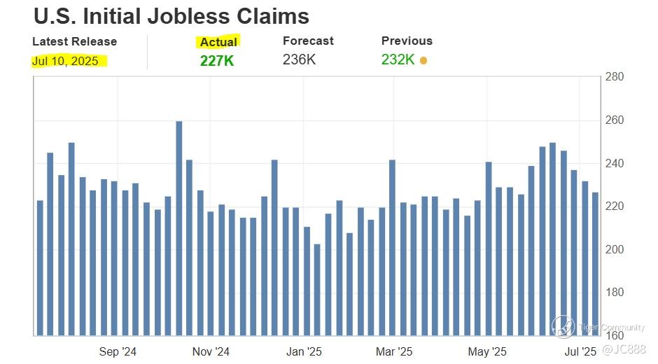 For week ending 5 Jul 2025, new applications for jobless benefits unexpectedly fell to a 7-week low.