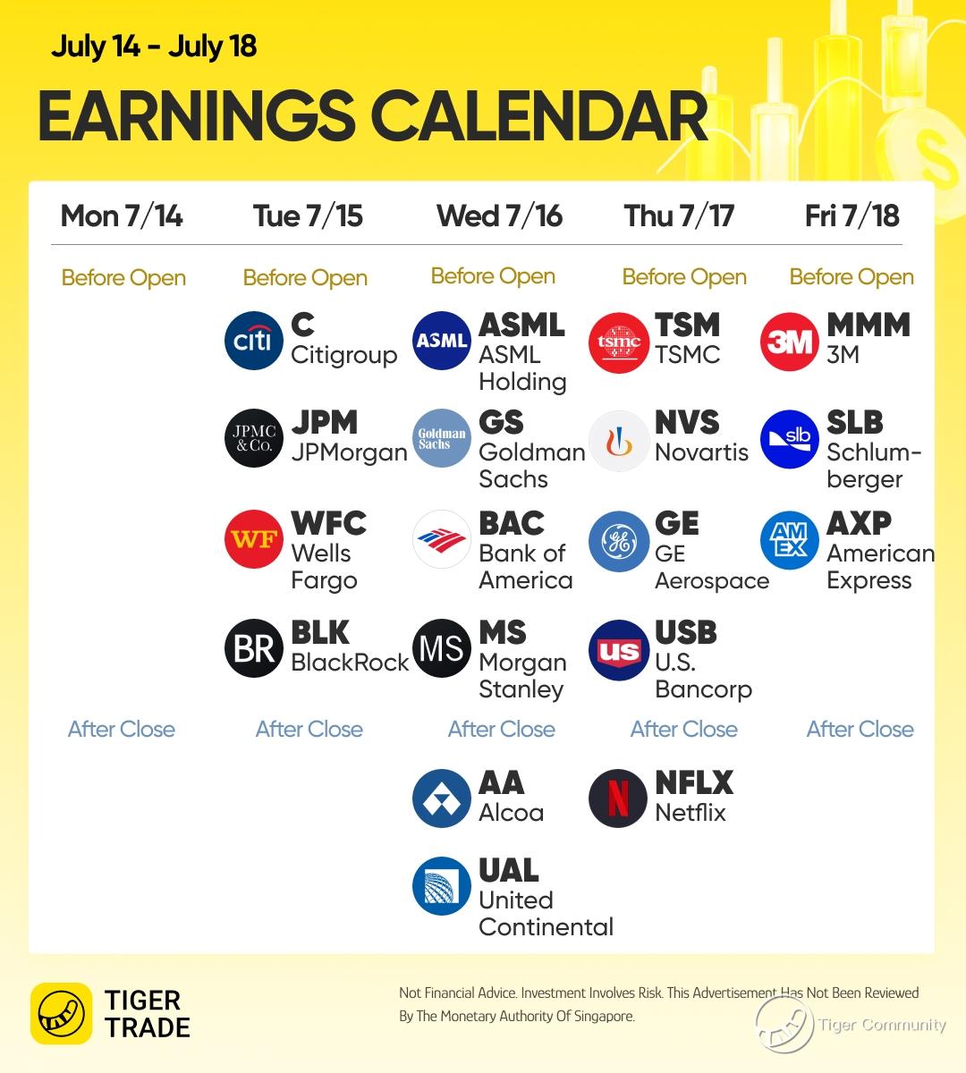 The US earnings season begins next week, with major companies like $JPMorgan Chase(JPM)$ $Citigroup(C)$ $ASML Holding NV(ASML)$ $Taiwan Semiconductor Manufacturing(TSM)$.