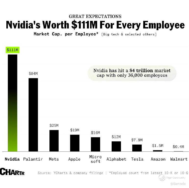 At $111M in market cap per employee, Nvidia doesn’t just outscale competitors, it compresses value creation into a magnitude we’ve never seen. Most firms grow by adding labour. Nvidia grows by scaling its developer ecosystem, foundry relationships, and sovereign-level demand pipelines.