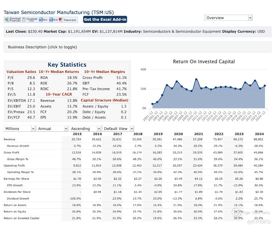Over the past 10 years, TSMC has demonstrated exceptional growth and stability in revenue and EPS, driven by its leadership in the semiconductor foundry market. Operating profits grew with margins expanding to 45.7%, reflecting financial strength. The company has consistently raised dividends, and its P/E ratio of 29.6 suggests a premium valuation justified by its market dominance. Strong FCF growth (20.2% CAGR), high gross margin (56.1% in 2024), and low debt (debt/equity 0.2) underscore its competitive advantages, including technological leadership in advanced nodes (e.g., 3nm), unmatched scale, and a critical role in the global tech supply chain. Despite a revenue dip in 2023, the 2024 recovery highlights its ability to navigate industry cycles effectively, positioning it well for continued success as of July 2025.