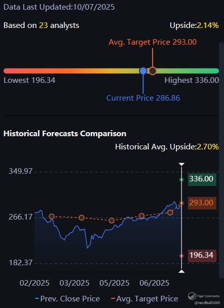 JPMorgan has a consensus "Moderate Buy" rating from Wall Street analysts, with 16 "buy," 4 "hold," and 2 "sell" recommendations out of 22 analysts. The average target price is around $293, suggesting a modest upside from current levels.