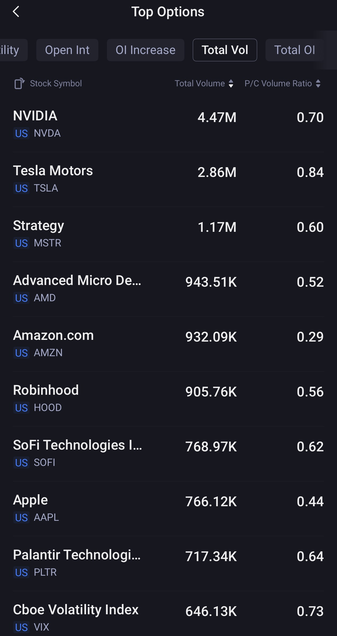 Top 10: $NVDA(NVDA)$, $TSLA(TSLA)$, $Strategy(MSTR)$, $AMD(AMD)$, $Amazon.com(AMZN)$, $HOOD(HOOD)$, $SOFI(SOFI)$, $AAPL(AAPL)$, $PLTR(PLTR)$, $Cboe Volatility Index(VIX)$