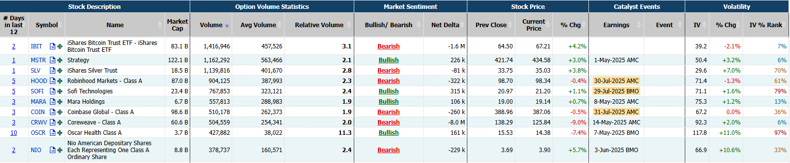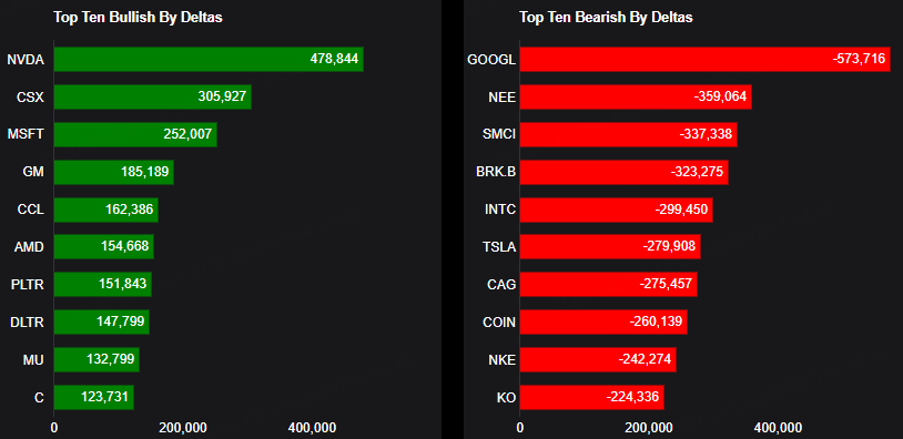 This report shows stocks with the highest volume of bullish and bearish activity by option delta volume, which converts option volume to an equivalent stock volume (bought or sold).
