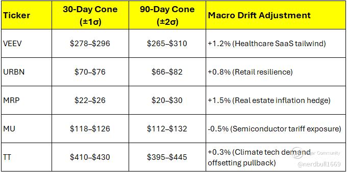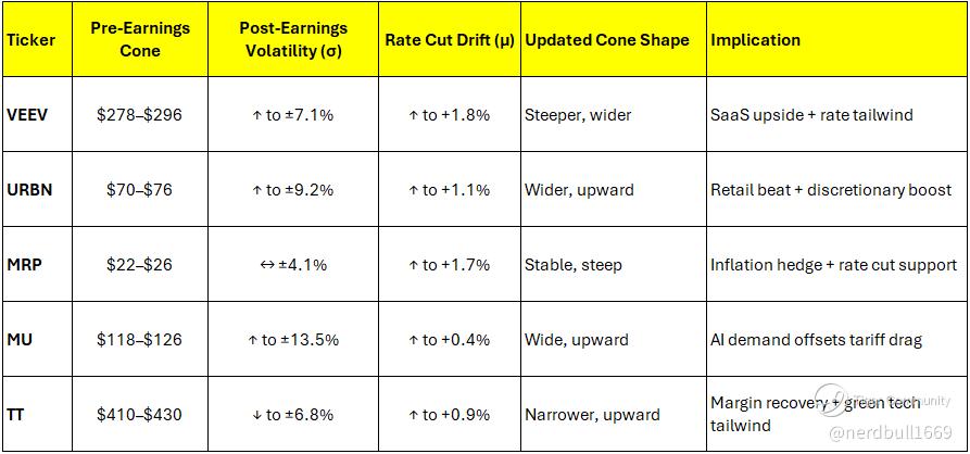 Key Insight: Rate cuts compress cost of capital and expand valuation multiples — especially for VEEV and MU. MRP remains a low-volatility anchor, while TT’s cone narrows post-earnings, signaling stabilization.