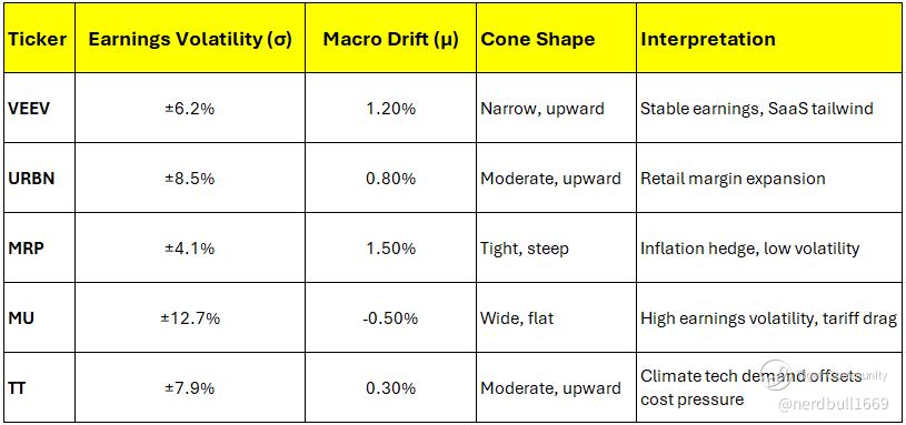 This cone visualizes each stock’s earnings volatility range (σ) against its macro-adjusted drift (μ), highlighting risk-adjusted upside.