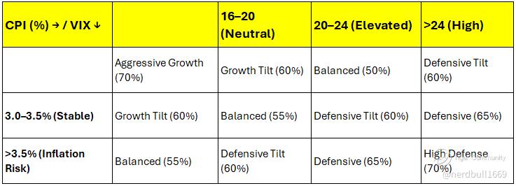 If CPI = 2.9% and VIX = 18 → Growth Tilt (60%)