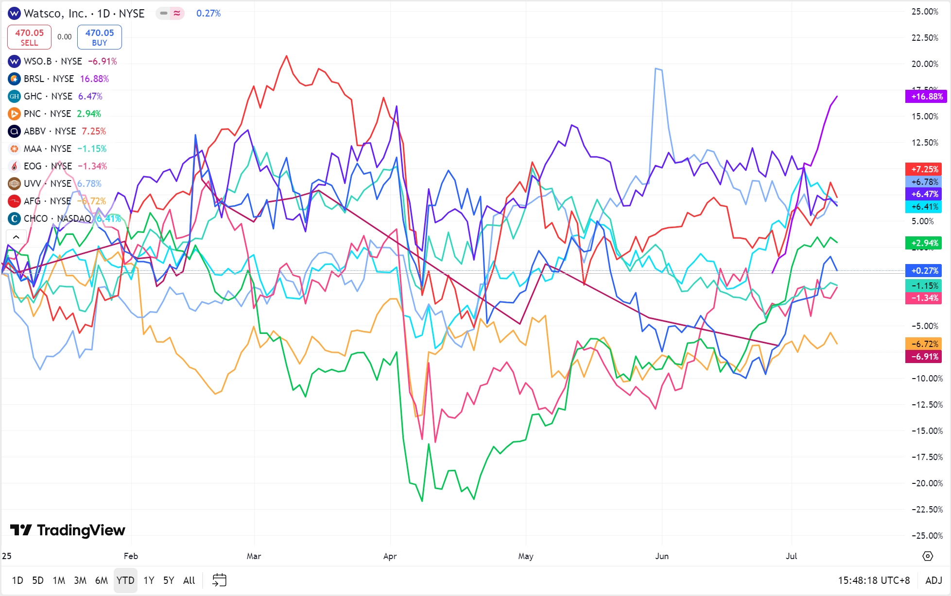 TradingView data from 2025 shows that while shares of companies such as $Watsco(WSO)$ , $Brightstar Lottery PLC(BRSL)$ , $Graham(GHC)$ , $PNC Financial Services Group Inc(PNC)$ , $AbbVie(ABBV)$ , $Universal(UVV)$ , and $City(CHCO)$ posted gains, those of $Watsco(WSO.B)$ , $Mid-America Apartment Communities(MAA)$ , $EOG Resources(EOG)$ , and $American(AFG)$ declined.