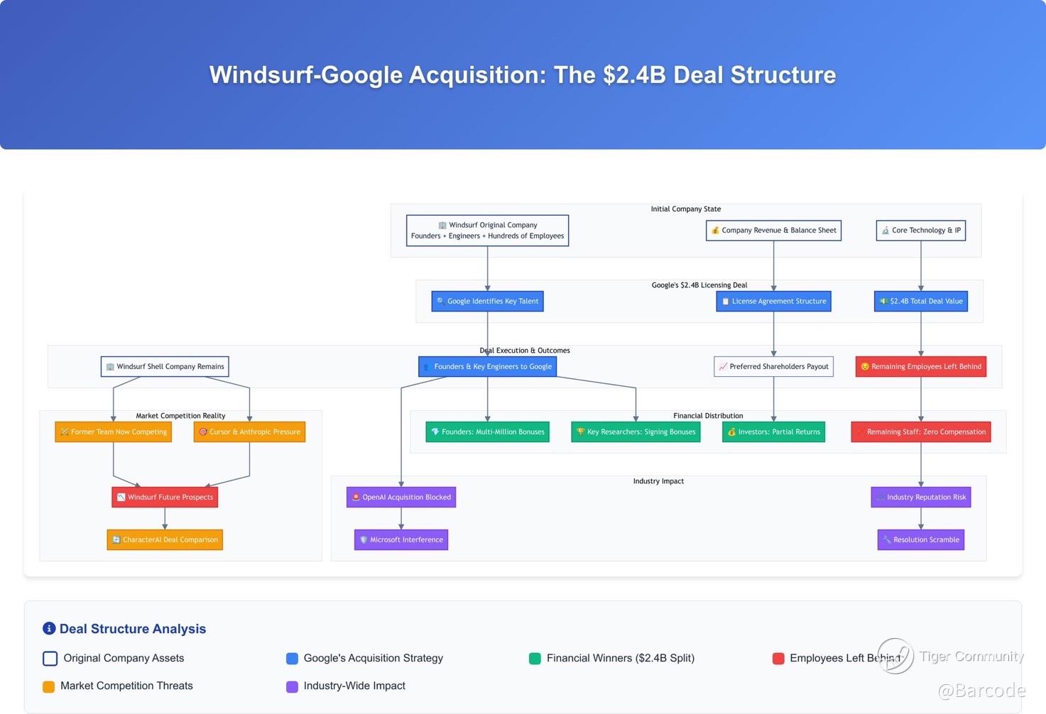 Google’s DeepMind just secured Windsurf’s AI coding talent and IP for $2.4B, outmaneuvering OpenAI after its $3B acquisition collapsed due to Microsoft’s IP restrictions. As part of the deal, Google hired CEO Varun Mohan and co-founder Douglas Chen, onboarding their entire R&D team into the Gemini AI stack.