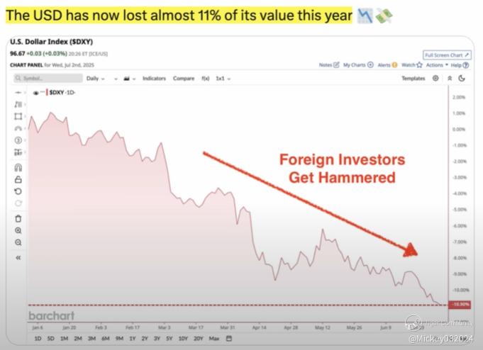 While the headline focus remains on tariffs, another major driver of volatility lies in the U.S. dollar itself. The greenback, after years of strength, has begun what some analysts describe as a record-setting collapse in real terms, pressured by persistent inflation, twin deficits, and shifts in global reserve allocation.