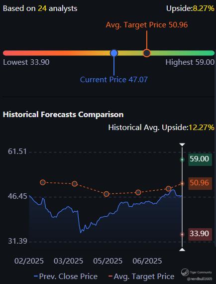 Based on 24 analysts from Tiger Brokers offering 12 month price targets for Bank of America in the last 3 months. The average price target is $50.96 with a high forecast of $59.00 and a low forecast of $33.90. The average price target represents a 8.27% change from the last price of $46.73.