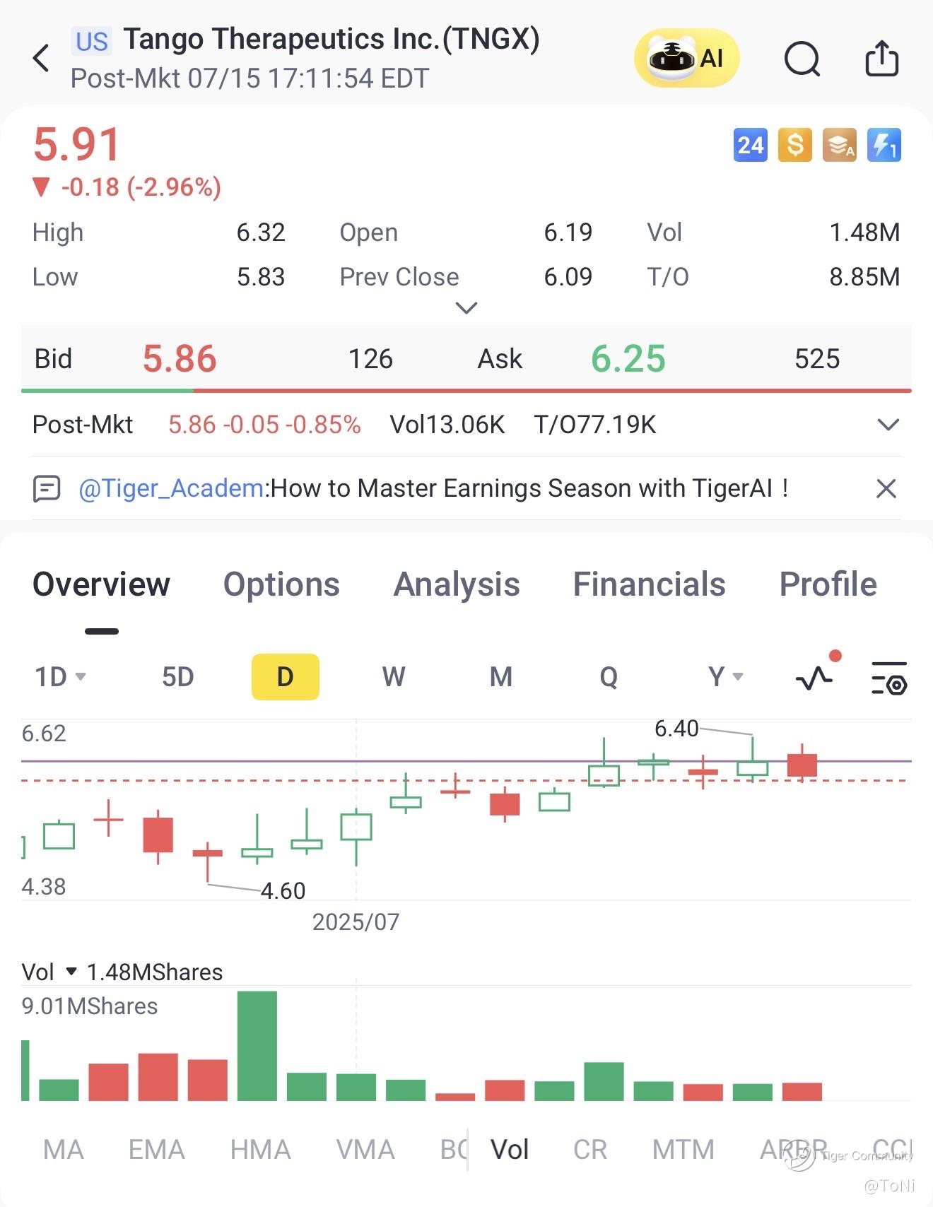 The near-term outlook hinges on clinical data. TNG462’s Phase 1/2 results, due in late 2025, are the pivotal event. Positive outcomes—demonstrating safety and efficacy—could catapult the stock toward the $11.00 target, with a stretch goal of $15.00 if partnered deals materialize. The current price of $5.91, supported at $5.83 and resisted at $6.32, offers a buying opportunity on any dip below $6.00. Volume of 1.48 million shares, against a T/O of 8.85 million, indicates growing interest, while the Golden Cross reinforces bullish momentum.