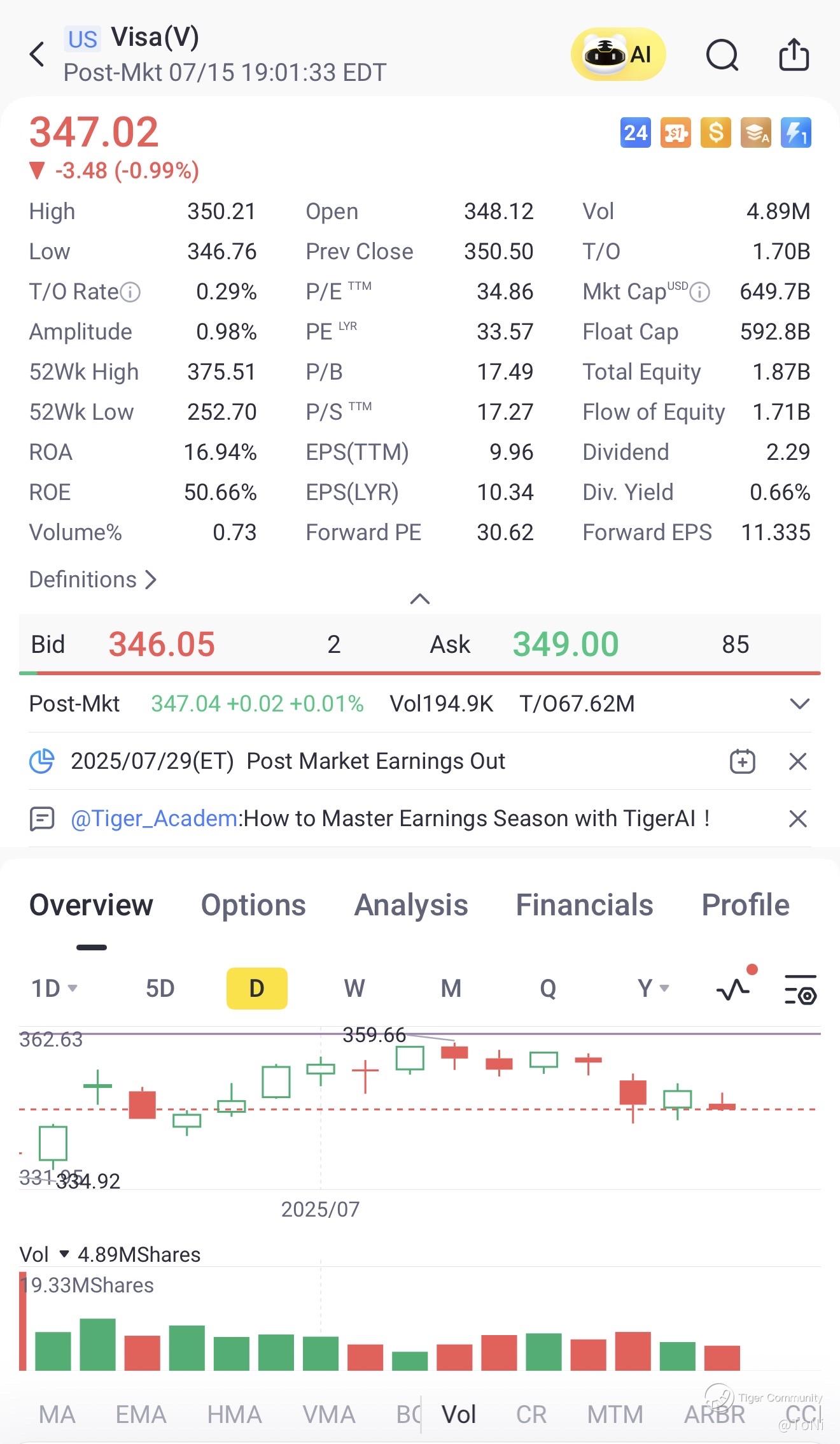 Key metrics further illuminate its health: a return on assets (ROA) of 16.94% and return on equity (ROE) of 50.66% highlight efficient capital utilization, while a cash-rich balance sheet supports its $2.29 annual dividend, yielding 0.66%. Despite a 0.99% dip to $347.02 post-market, the stock’s 52-week range ($252.70–$375.51) and float cap of $592.8 billion signal stability and investor confidence. Visa’s business model—earning transaction fees on 192.5 billion processed transactions annually—remains a cash cow, insulated from direct lending risks that plague traditional banks.
