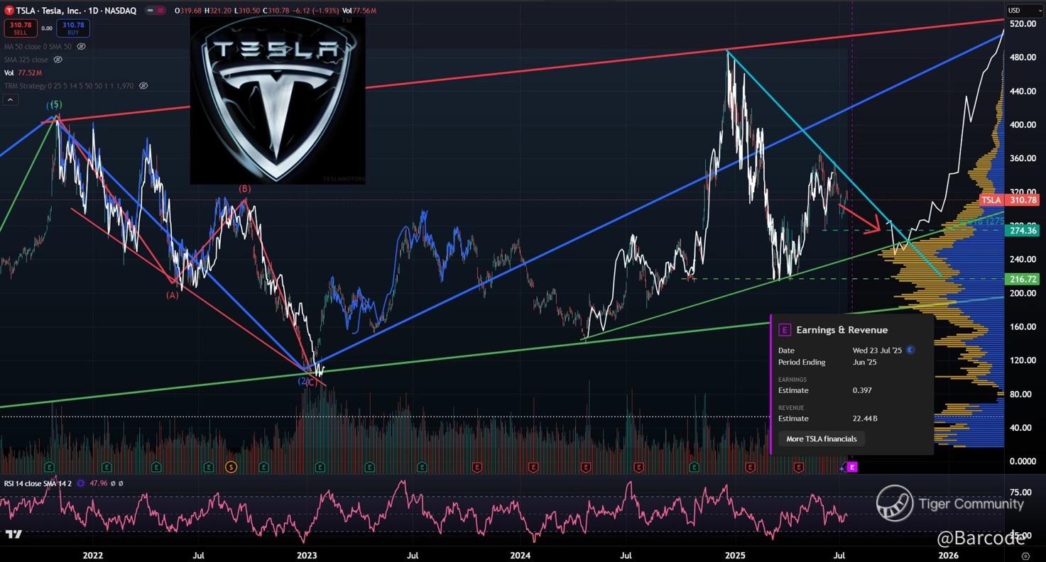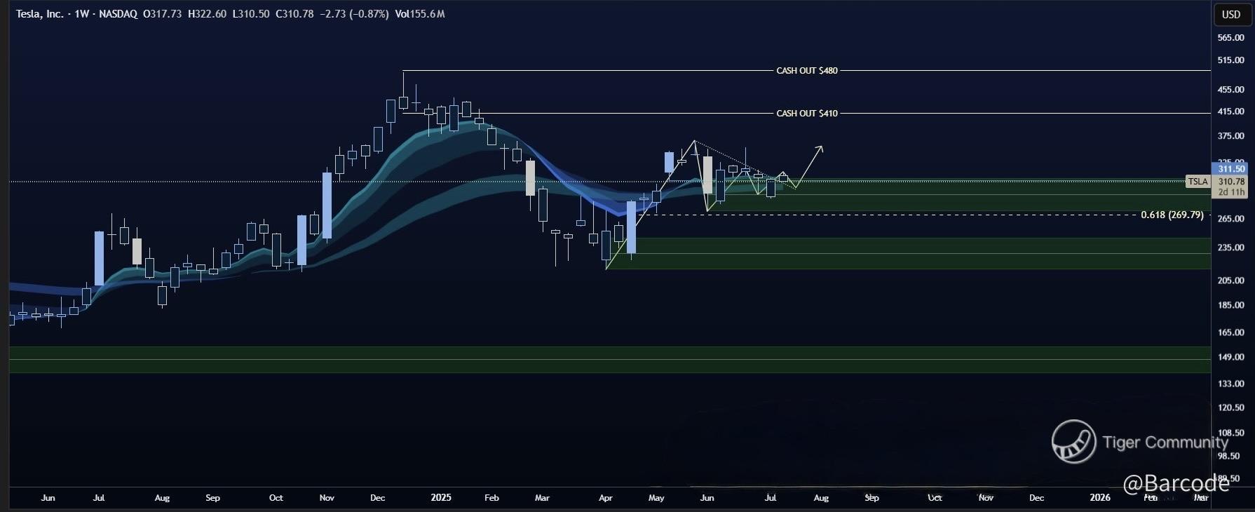 Technically, $TSLA is hugging a critical weekly support zone near $310, holding above the 30W MA and compressing inside a tight consolidation structure. RSI and MACD are curling from mid-range levels, and volume remains subdued, suggesting a buildup in potential energy. If bulls defend this level and push past $335, the projected measured move targets the $410 region, followed by a cash-out zone at $480.
