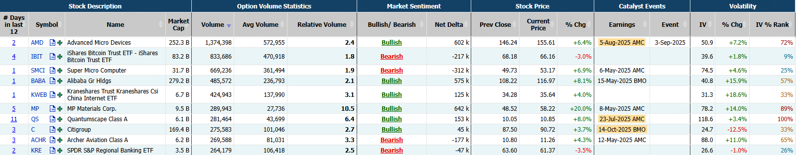 This report shows stocks with the highest volume of bullish and bearish activity by option delta volume, which converts option volume to an equivalent stock volume (bought or sold).