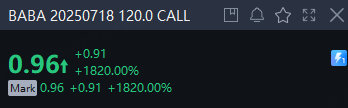 There are 465.35K Alibaba option contracts traded on Tuesday, up 180% from the previous trading day. Call options account for 77% of overall option trades. Particularly high volume was seen for the $120 strike call option expiring July 18, with 30,574 contracts trading. $BABA 20250718 120.0 CALL$