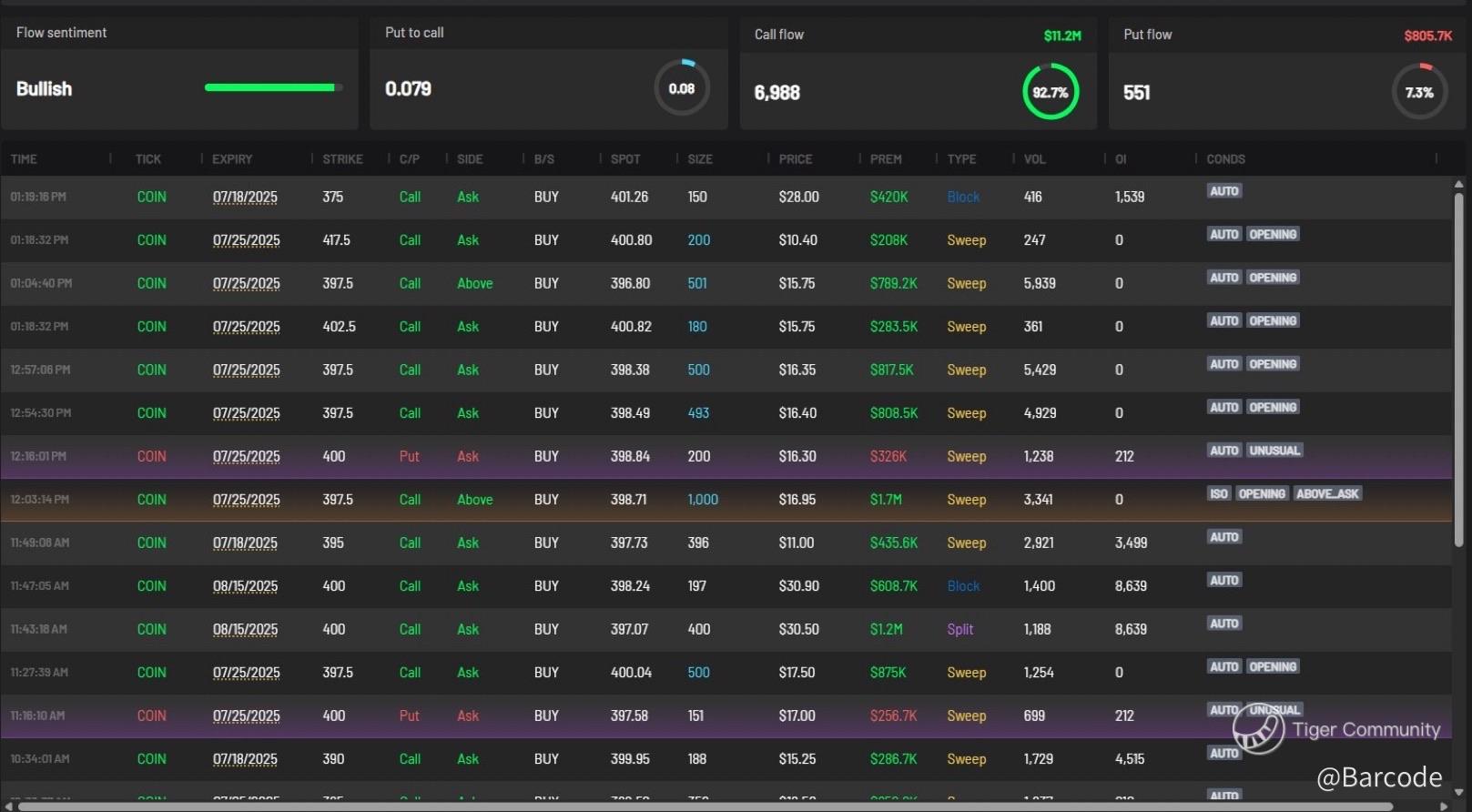 Technically, COIN cleared a 3-month resistance shelf. With bullish continuation candles printing on strong volume, the daily chart targets $427 on extension. Gamma flow into next-week $410–$420 calls has exploded, suggesting institutions are managing upside risk or quietly accumulating.