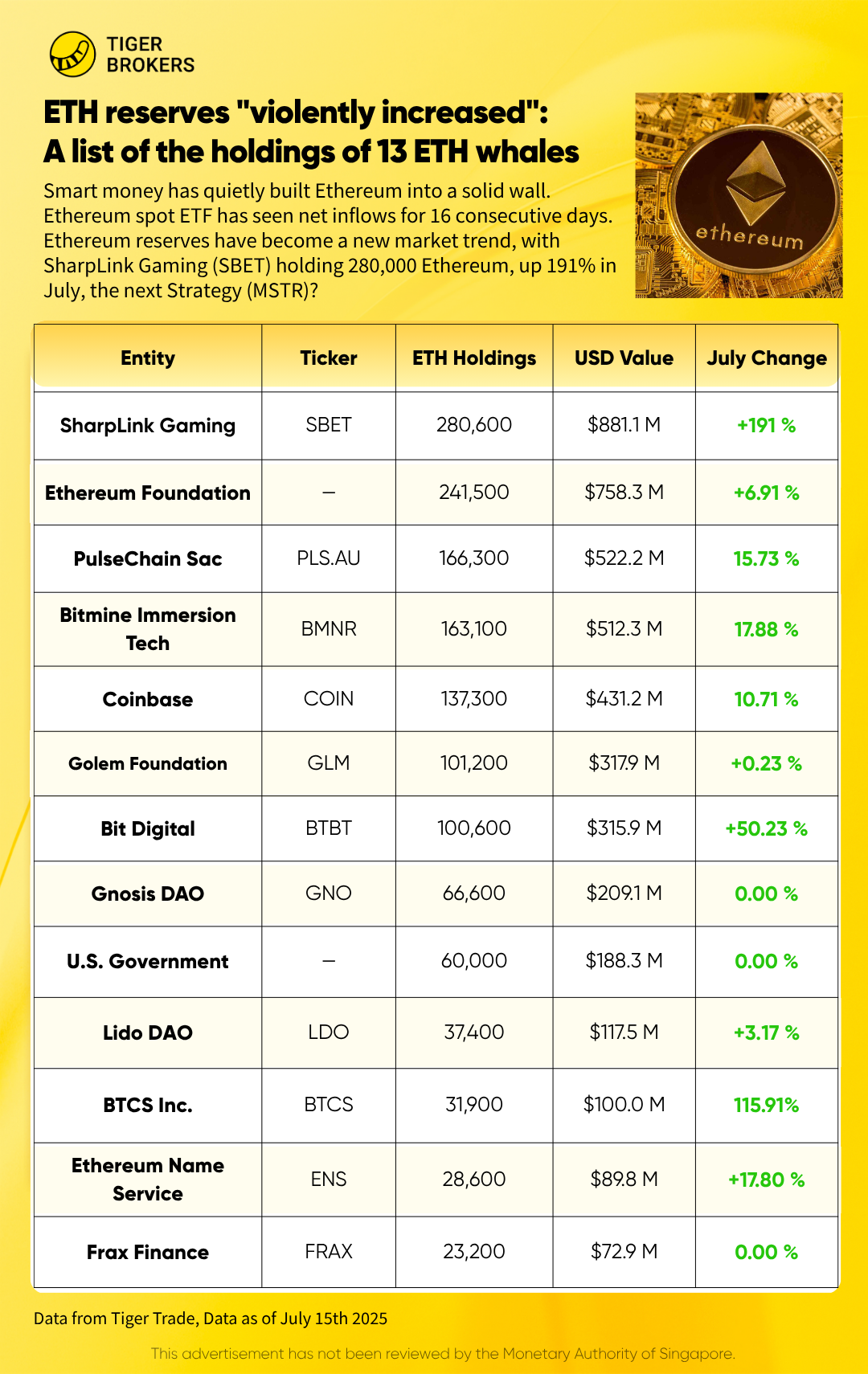 Among the above whales, there are 6 ETH-heavy holding stocks: $SharpLink Gaming(SBET)$ , $BitMine Immersion Technologies Inc.(BMNR)$ , $Coinbase Global, Inc.(COIN)$ , $Bit Digital, Inc.(BTBT)$ , $BTCS Inc.(BTCS)$ , $EnerSys(ENS)$
