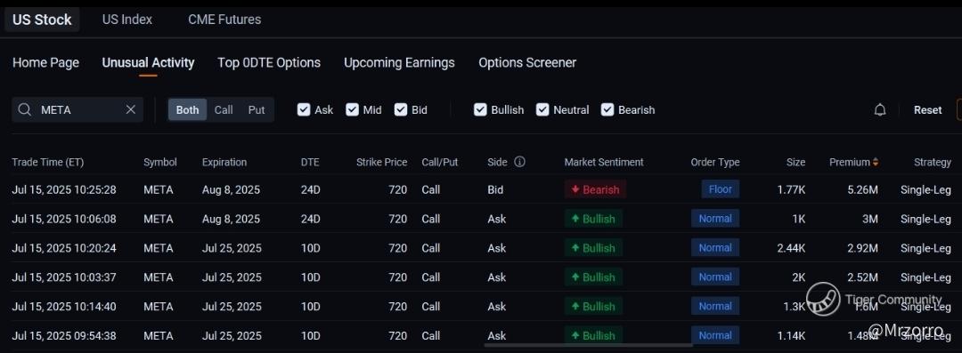 Five of the six block trades posted on Meta options so far Tuesday were bullish, with the buyers paying premiums ranging from $1.48 million to $3 million. The biggest of those bullish transaction involved the purchase of call options that give their holder the right to buy 100,000 Meta shares at $720 each in 24 days. That strike price is above the current stock price of $717.42.