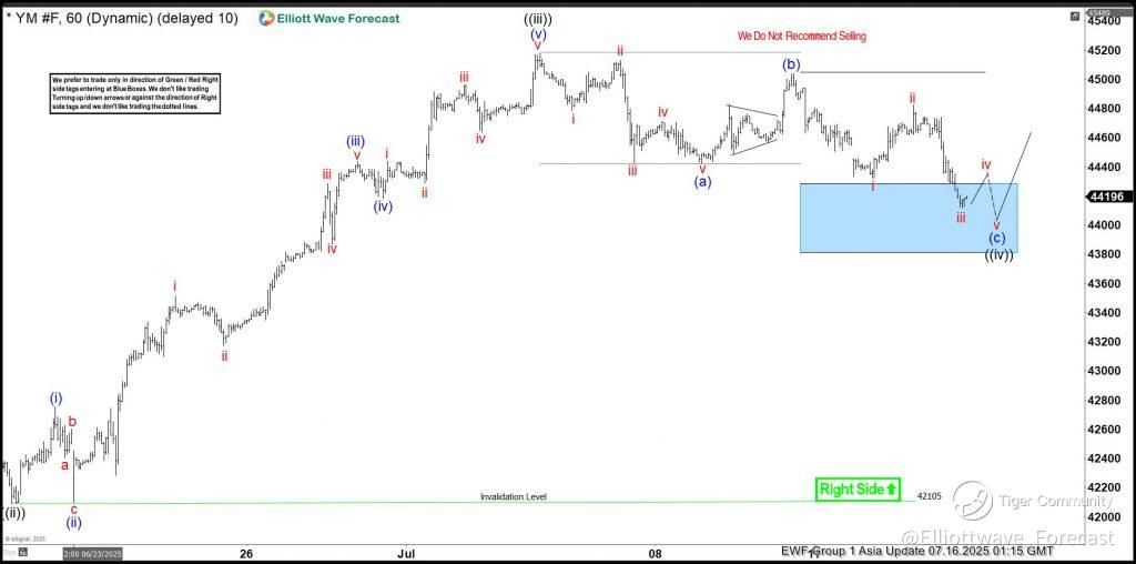 The Dow Jones E-mini Futures (YM_F) favors impulsive rally from 4.07.2025 low of 36708. It is trading close to the previous high of 1.31.2025 of 45227. A break above that level will confirm the bullish sequence. Other US indices like Nasdaq & S & P 500 futures already confirmed the new high in daily, calling for more upside against April-2025 low. As per latest Elliott wave sequence in Dow Jones, it favors upside & pullback in 1-hour remain supported in extreme area to rally higher. Since April-2025 low, it placed 1 at 42976 high & 2 at 41236 low. Above there, it favors upside in 3 of (1) & expect one more push higher, while dips remain above price trendline. We like to buy the pullback in 3, 7 or 11 swings at extreme area for next rally.