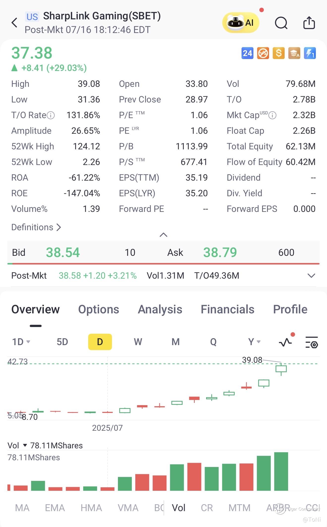 SharpLink’s recent rise is fueled by its strategic ETH acquisition. Between July 7 and 11, 2025, the company purchased 10,000 ETH from the Ethereum Foundation for $413 million, surpassing the foundation to become the largest corporate ETH holder. This move triggered a significant market reaction, with the stock climbing to $37.38 in after-hours trading on July 16, up 29.03% from $28.97, and trading volume surging to 79.68 million shares.