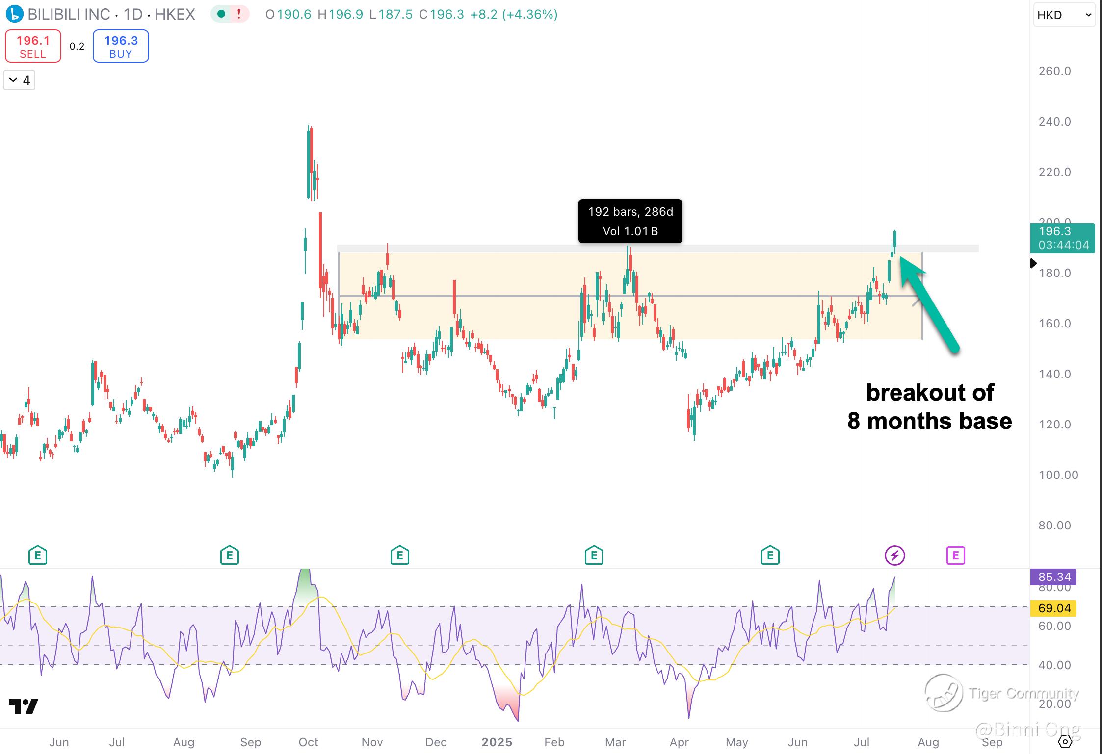 BILI has broken out of an 8-month base consolidation, clearing a key resistance zone around HKD 185–190 (bili broke out of the resistance on HK trading hours)