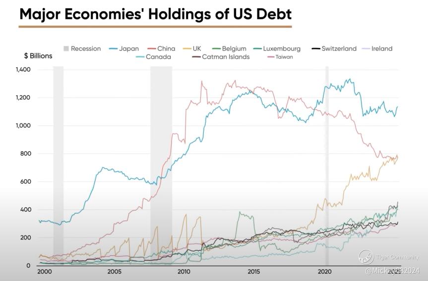 Foreign holdings of U.S. Treasuries peaked in 2013 and have declined steadily as a share of total debt. China, once the largest foreign holder, has trimmed its Treasury portfolio by over 30% in the past five years amid geopolitical tensions. Japan, now the top foreign holder, has also slowed purchases as it contends with its own rising yields and currency pressures.