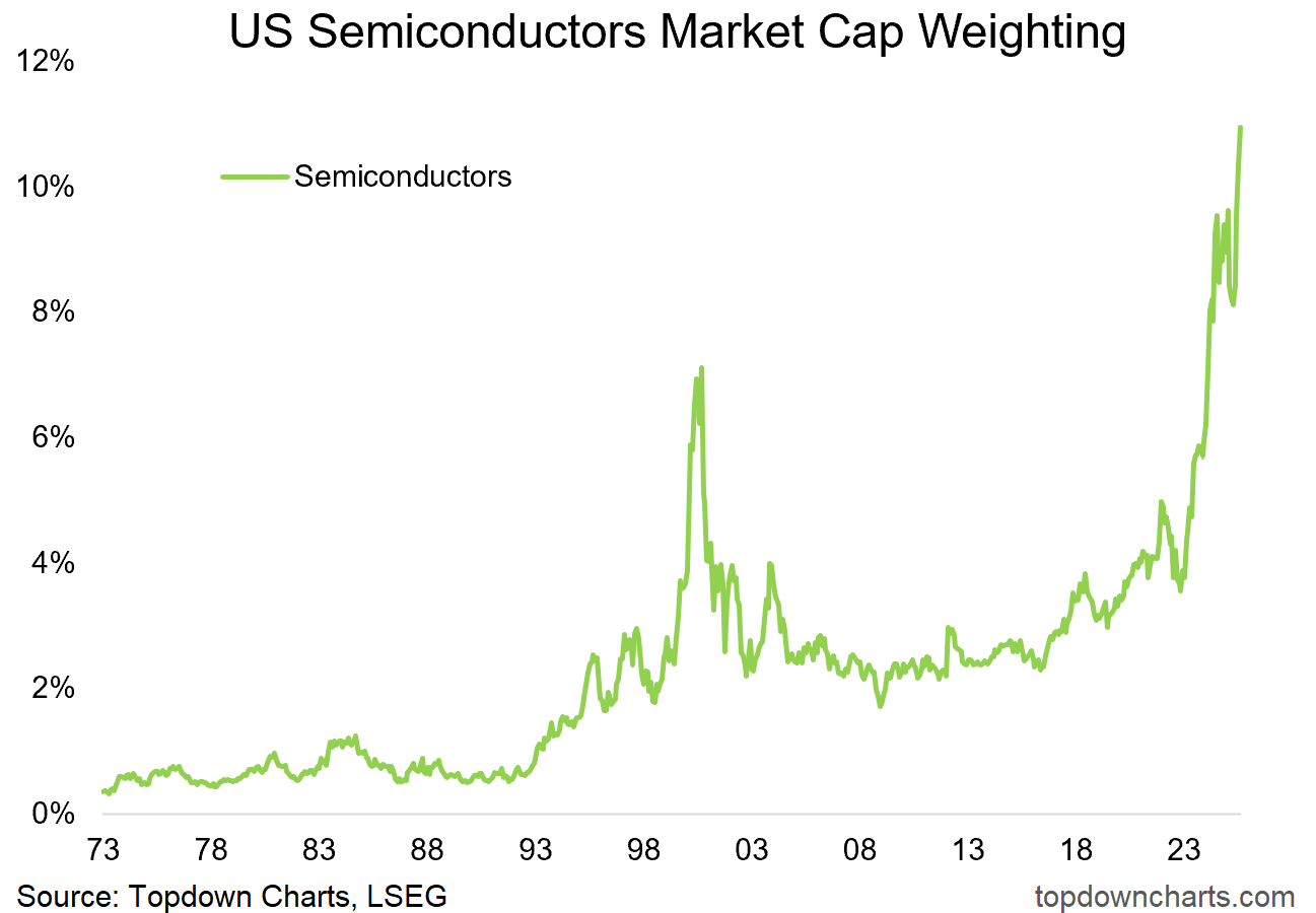 This week’s chart is a perfect illustration… It shows the path of US Semiconductors’ market cap weighting (which has just reached a new all-time high).