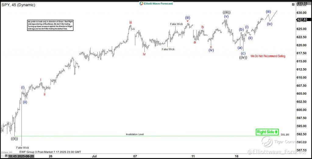 In 1-hour above ((ii)) low of 591.89 low, it ended (i) at 605.96 high, (ii) at 603.17 low, (iii) at 626.87 high as extended move, (iv) at 620 low & (v) as ((iii)) at 627.97 high. Wave ((iv)) ended in 3 swing pullback as shallow connector slightly below 0.236 Fibonacci retracement of ((iii)). Within ((iii)), it ended (a) at 619.8 low, (b) at 624.12 high & (c) at 618.05 low on 7.16.2025 low (this week). Above there, it favors rally in ((v)) of 3 targeting in to 630.31 – 651.1 area before correcting in 4. Within ((v)), it placed (i) at 624.73 high, (ii) at 623.08 low & favors upside in (iii) of ((v)). We like to buy the pullback in clear 3, 7 or 11 swings correction at extreme area in 4 and later in (2) pullback, once finished (1) in 5 swings.