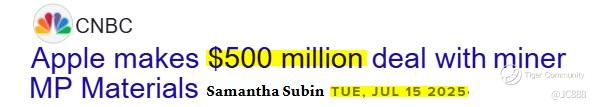 This time it was because $Apple(AAPL)$ and miner MP Materials are joining forces in a $500 million deal to develop a rare earth magnets recycling facility, that will reinforce the iPhone maker’s US supply chain.